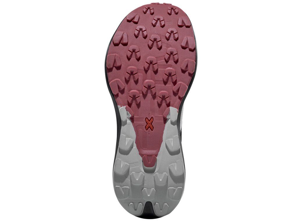 Základem boty je inovativní mezipodešev XFlow™ Endurance, která kombinuje vysokou úroveň tlumení, odolnost a stabilitu. Zvýšené tlumení (37 mm pata / 31 mm špička) chrání nohy před únavou a nárazy, a to i při běhu na tvrdém povrchu nebo v kamenitém terénu. Stabilní platforma (cca 85mm pata/ 110mm špička) vám zaručí jistotu došlapu i v technickém terénu. Podrážka FriXion® Red spojuje lepivou gumu v přední části pro jistotu na technických pasážích a odolnější směs v patě pro dlouhou životnost. 4mm špunty poskytují dostatečný záběr na sypkém podkladu, přitom zůstávají komfortní i na tvrdších cestách. Díky této kombinaci se Prodigio Max hodí jak do hor, tak na lesní a šotolinové cesty.