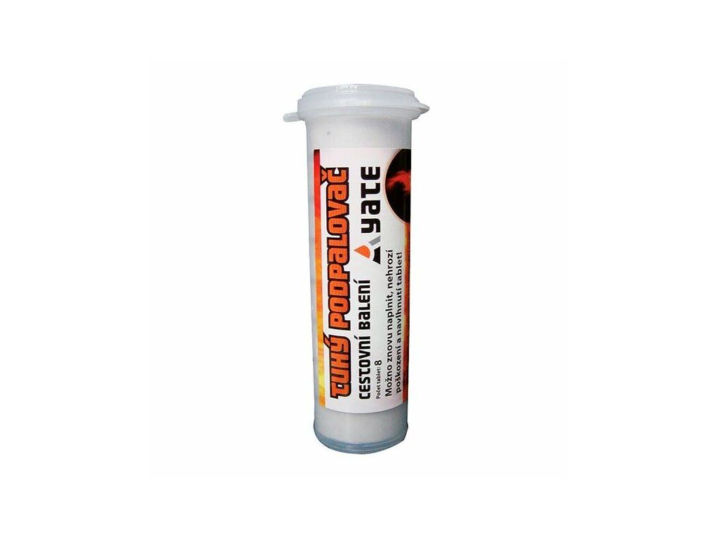Cestovní balení, 6 kusů tablet v PE tubě, kterou je možno opakovaně naplnit. Tuba chrání tablety před vlhkem a poškozením. Tablety jsou vhodné jako palivo do vařiče na tuhý líh nebo pro roztápění kamen, ohnišť a grilů. Pro rozdělání ohně obvykle stačí 1/2 tablety.Varování. Hořlavá tuhá látka. Může vyvolat alergickou kožní reakci. Při vdechování může vyvolat příznaky alergie nebo astmatu nebo dýchací potíže. Uchovejte mimo dosah dětí. Uchovávejte/skladujte odděleně od dosahu možných zdrojů zapálení. Zamezte vdechování prachu/dýmu. Zabraňte styku s očima. Po manipulaci důkladně omyjte ruce vodou a mýdlem. Použijte ochranné rukavice. Parametry Materiál: Tuhý líh Barva: Bílá Rozměr: 10x3 cm Objem: 6 ks l Hmotnost: 48 g +-5% Obecné informace o produktuZáruční doba 24 měsícůVýrobce Yate